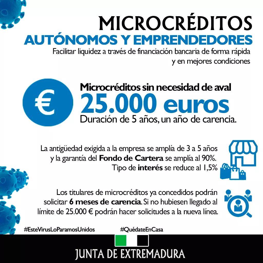 Esta linea de microcréditos forma parte del conjunto de medidas que la Junta de Extremadura va a poner en marcha para sostener la actividad de las empresas extremeñas afectadas por la crisis del COVID 19 para complementar las puestas en marcha por el Gobierno de España.